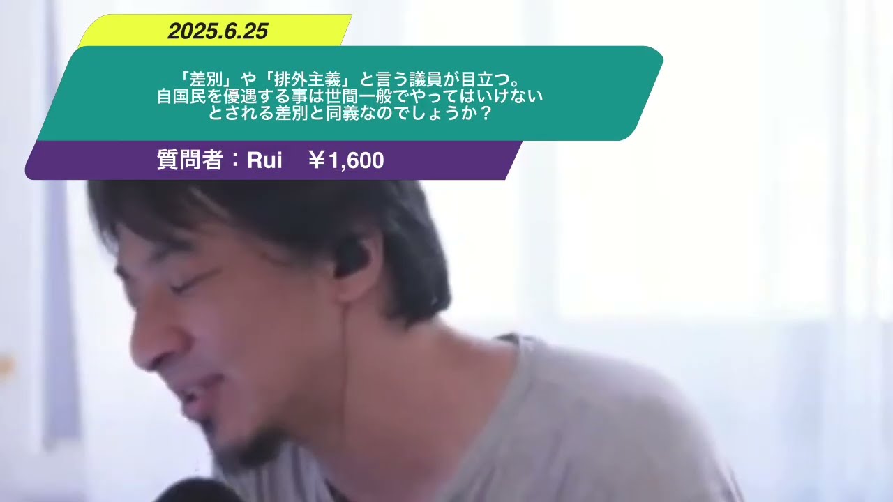 とりあえず「差別」や「排外主義」と言っておけば相手が怯むだろう、みたいな考えの議員が目立つようになってきた気がしますが、自国民を優遇する事は世間一般でやってはいけないとされる差別と同義なのでしょうか?