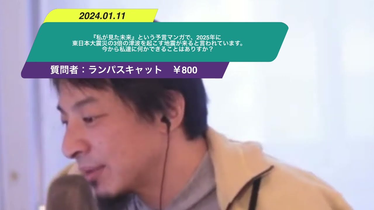 Kind: captionsLanguage: jaえ私が見た未来という予言漫画で2025年4月5日4月184時18分もしくは16時18分に東日本大震災の3倍の津波地震が来ると言われています今から私たちに何かできることありますかありませんえっとまそのなんか地震学校の将来来るよって言うとま将来いつかは来るのでなんか近辺に来るかもしれないし来ないかもしんないしっていうのででもしその本当に南海トラフの地震が怖いのであればもうあのとか東京とかに住むのをやめてくださいあの海外に住むとかが安全なんじゃないかなと思いますけど要はあのなんかこの期間必ず起きますっていうのでなんか23日だけ東京離れたら大丈夫みたいな話じゃないと思うんですよねまその30年以内には8割ぐらい起きると言われてるのでなので残りの人生が30年以上ある人であればまその東海地方東京とかにある不動産は買わないとかっていう感じの選択肢になるんじゃないかなと思いますけどもJA