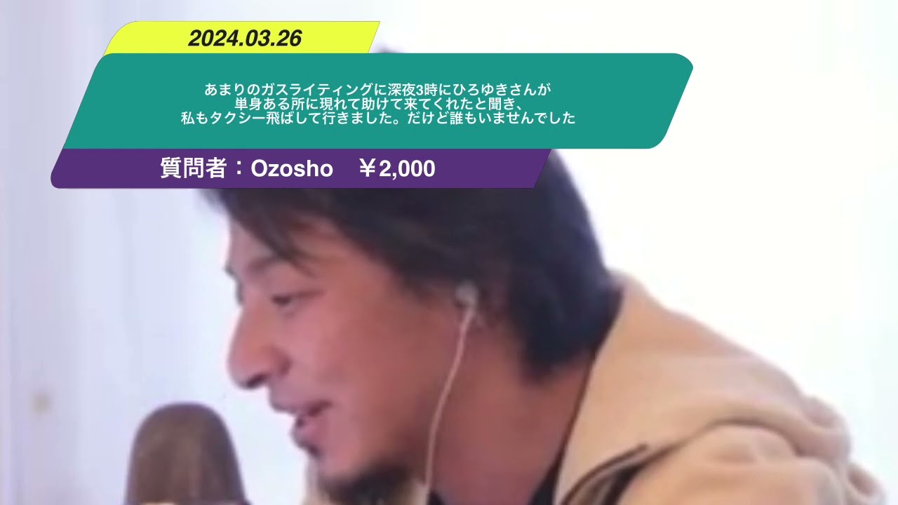 あまりのガスライティングに深夜3時にひろゆきさんが単身ある所に現れて助けて来てくれたと聞き、私もタクシー飛ばして行きました。だけど誰もいませんでした。現実のひろゆきさんだったらありますか?