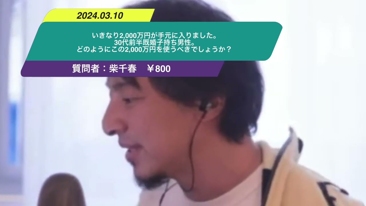 いきなり2,000万円が手元に入りました。30代前半既婚子持ち男性です。家族の遺産やら貯金やら退職金やらで資産が2,000万円ほどになり現在無職です。どのようにこの2,000万円を使うべきでしょうか?また、ひろゆきさんならどのように2,000万円を運用しますか?