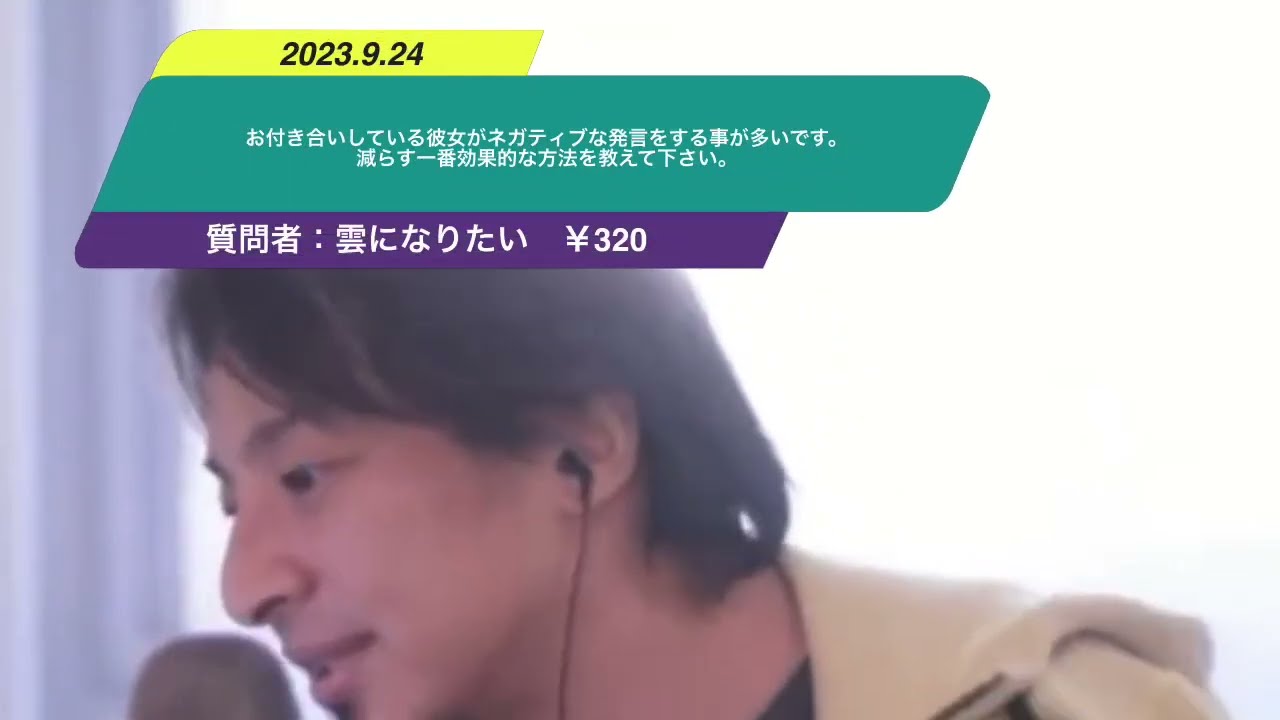 Kind: captionsLanguage: jaえお付き合いしてる彼女がネガティブな発言をすることが多いです減らす1番効果的な方法を教えてくださいえっとあなたがもっとネガティブなことを言ってみてくださいえっと別に僕あのネガティブなことを彼女から言わせなくするよりそのあなたがネガティブなことを言われても気にしない性格になるという方が人生にとって得だと思うんですけどそれでも彼女を変えたいのであればもっとネガティブなことをバンバン言うっていうのでネガティブなやつってやべえなっていう風にちゃんと分かってもらえるっていうのをすればいいんじゃないです
