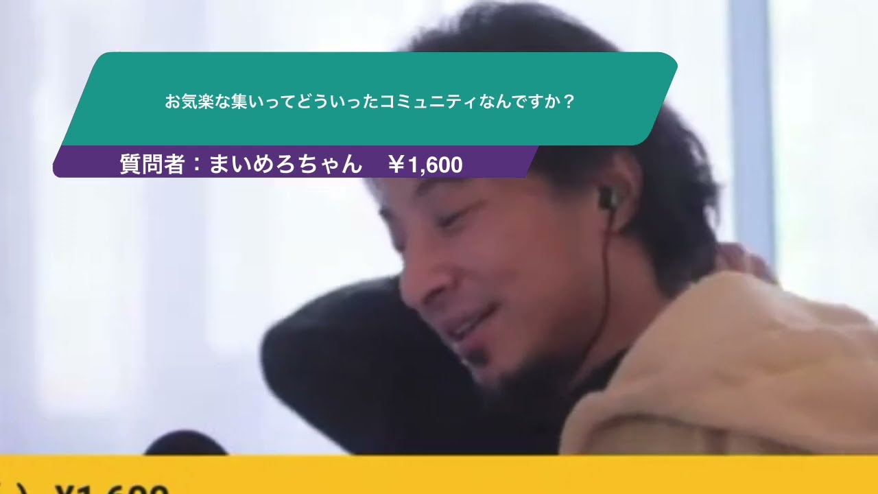 先日の超会議で出会ったひろゆき友達に「まいめろちゃんも入りなよ!」とコミュニティ(お気楽な集い)のことを教えてもらい入ってみました!コミュニティを見てみるとひろゆきさんのことをツイートしてる人は少ないなという印象でしたが、お気楽な集いってどういったコミュニティなんですか?