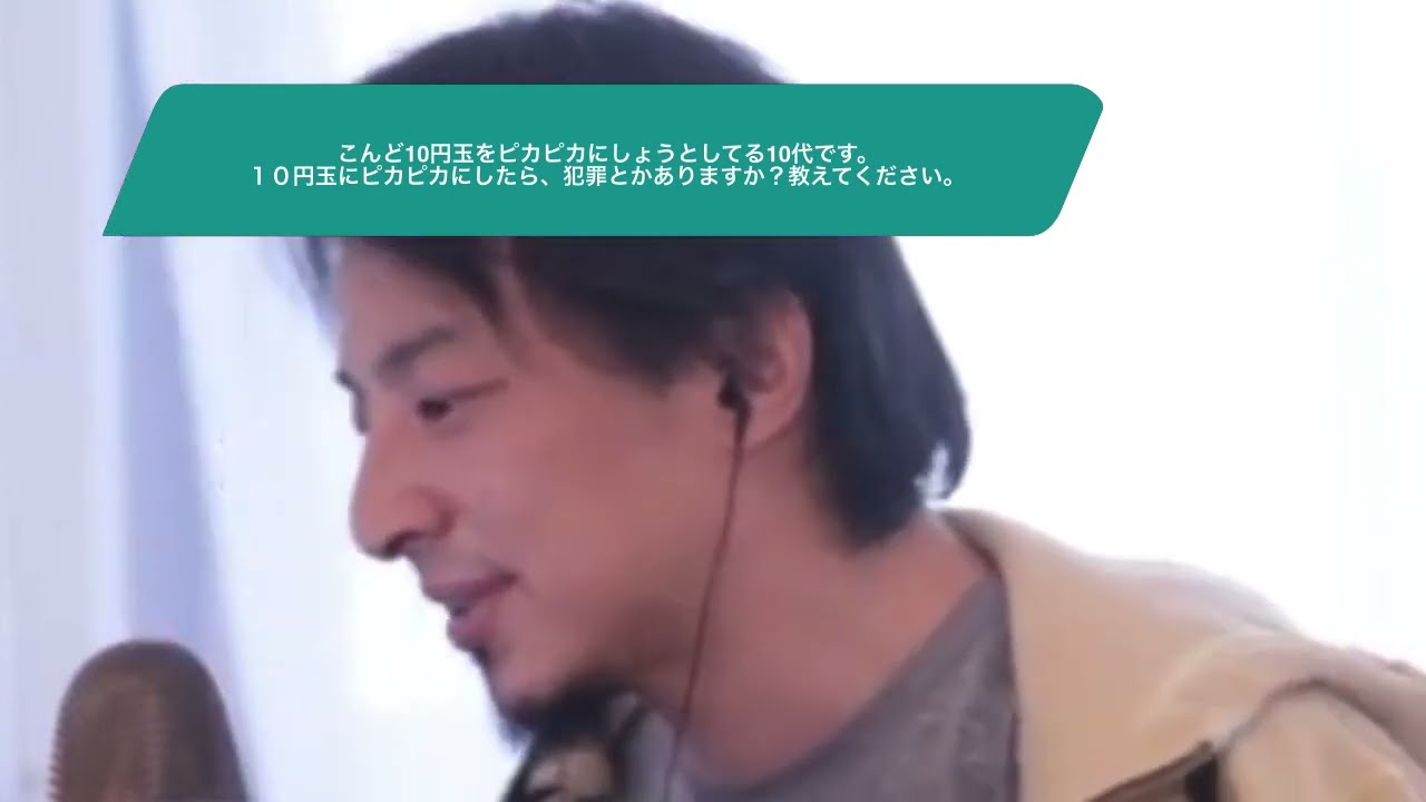 Kind: captionsLanguage: jaえー初見で失礼します今度10円玉をピカピカにしようとしてる重代です10円玉をピカピカにしたら犯罪とかありますか教えてくださいえ全くないですあの壊したりその削ったり読めなくしたりする場合はその効果をあの壊したってことは反対なるんですけど綺麗にする分には別に全然問題なのでなのであのソースとかにつつけるといいんじゃないかなと思います賛成のものにつけたりしてあのどをその参加してる部分を削ったりすると綺麗になったりします