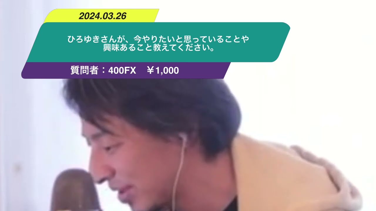 ひろゆきさん、こんばんは。いつもオフラインに入れて仕事中BGMで聴いてます。ひろゆきさんが、今やりたいと思っていることや興味あること教えてください。