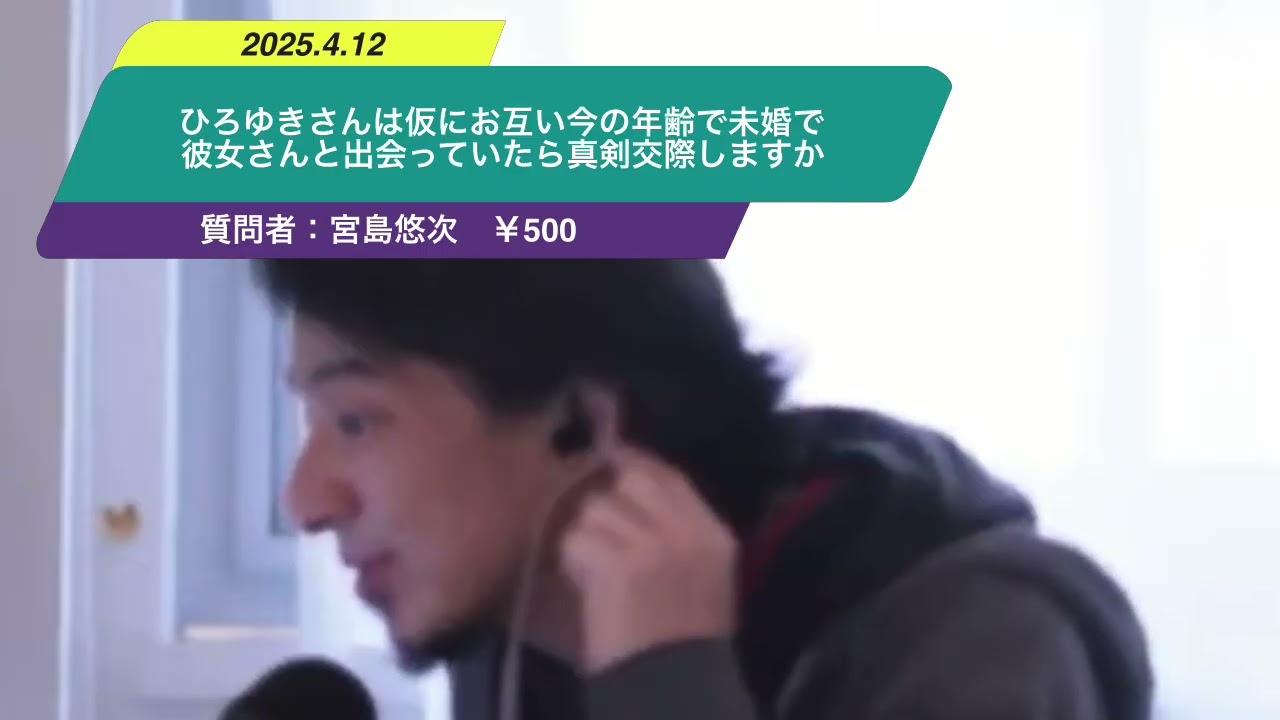 彼女さんが家にいる事を前提で質問しますひろゆきさんは仮にお互い今の年齢で未婚で彼女さんと出会っていたら真剣交際しますか
