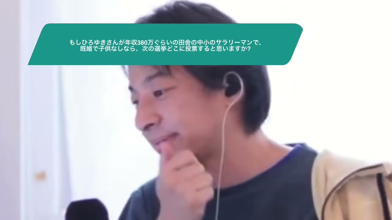 【ひろゆき】もしひろゆきさんが年収380万ぐらいの田舎の中小のサラリーマンで、既婚で子供なしなら、次の選挙どこに投票すると思いますか? ー ひろゆき切り抜き 20241015