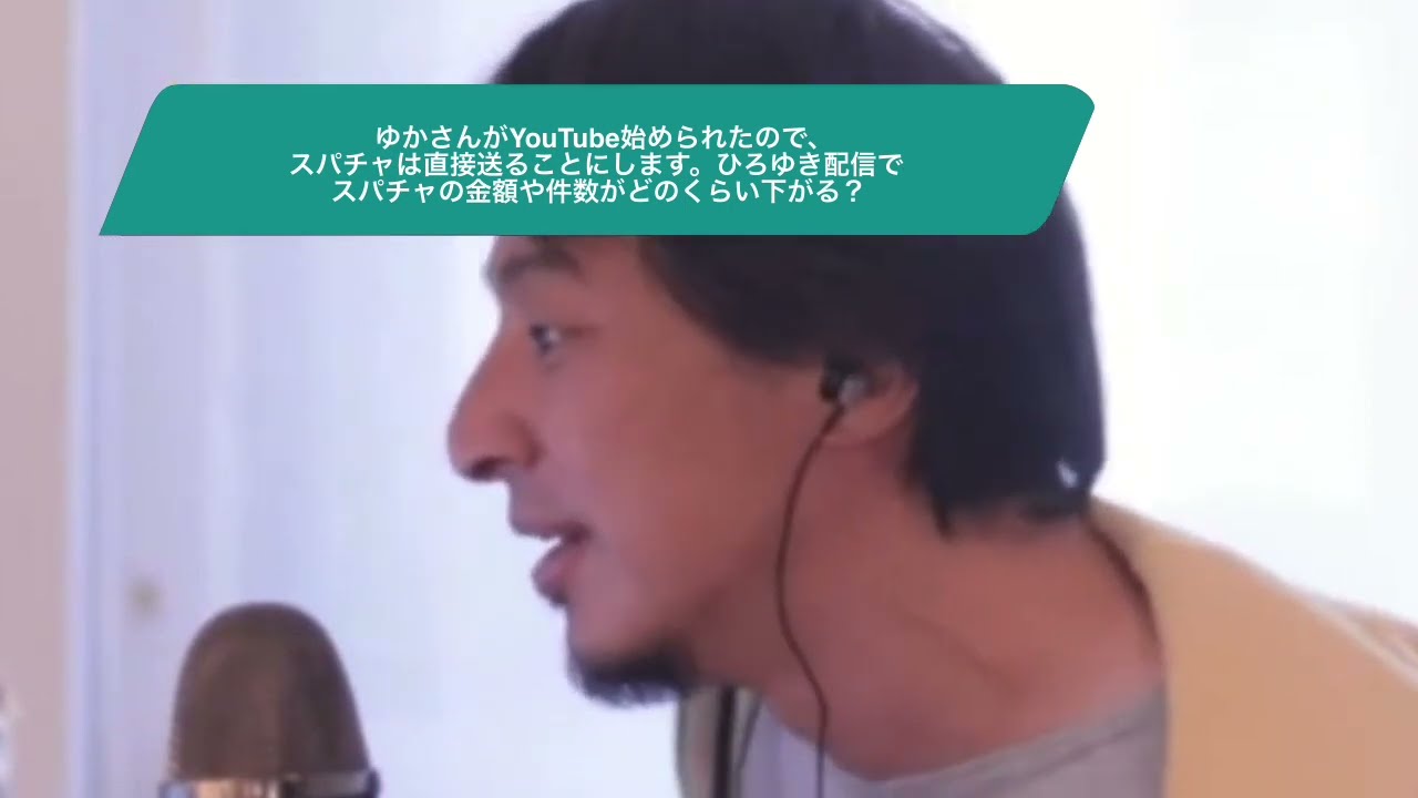こんばんは。ゆかさんがYouTube始められたので、ゆかさん宛てのスパチャはご本人に直接送ることにします。今後のひろゆき配信でスパチャの金額や件数がどのくらい下がるものなのかに興味があり、差し支えない範囲で教えてもらうことはできますか。