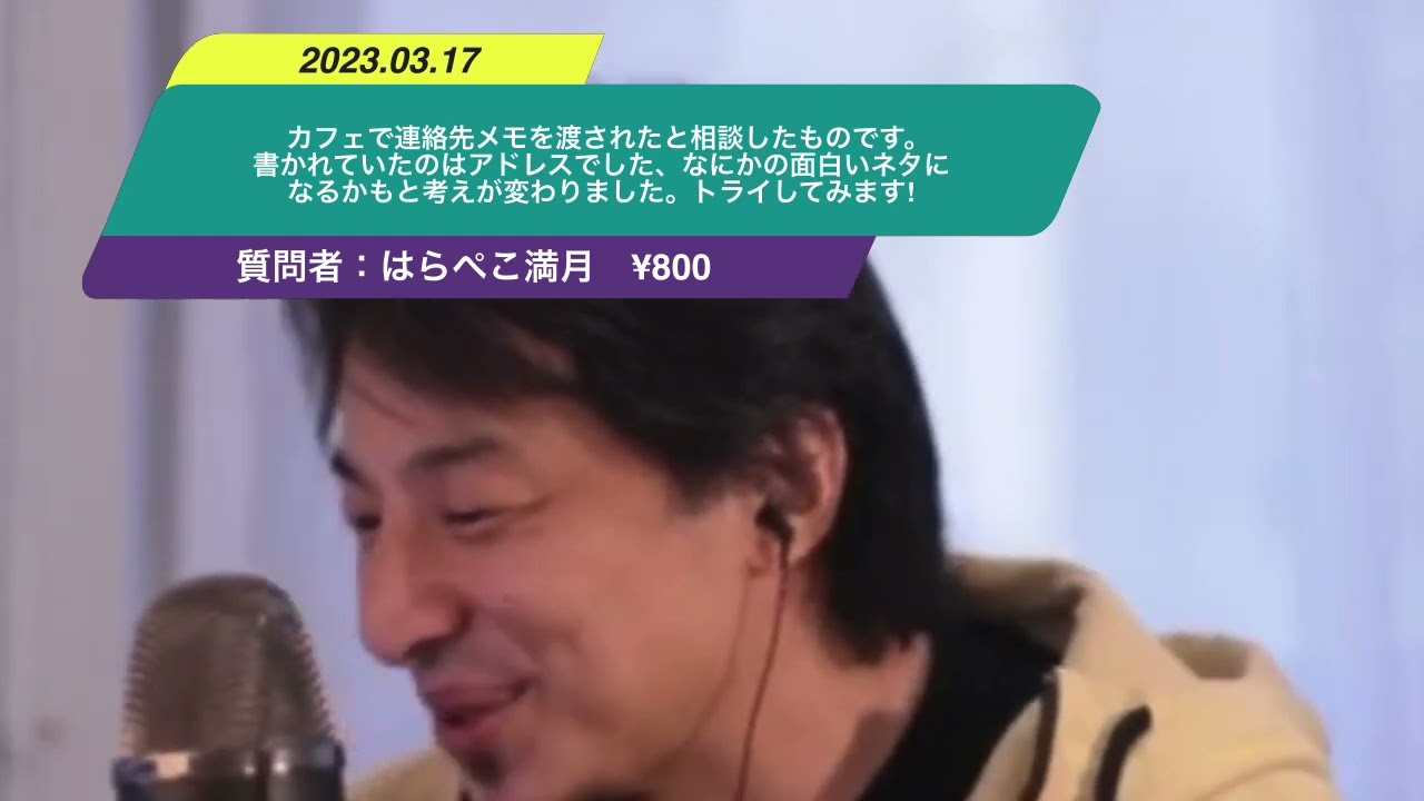 【ひろゆき】カフェで連絡先メモを渡されたと相談したものです。書かれていたのはアドレスでした、なにかの面白いネタになるかもと考えが変わりました。トライしてみます! ー ひろゆき切り抜き 20230317