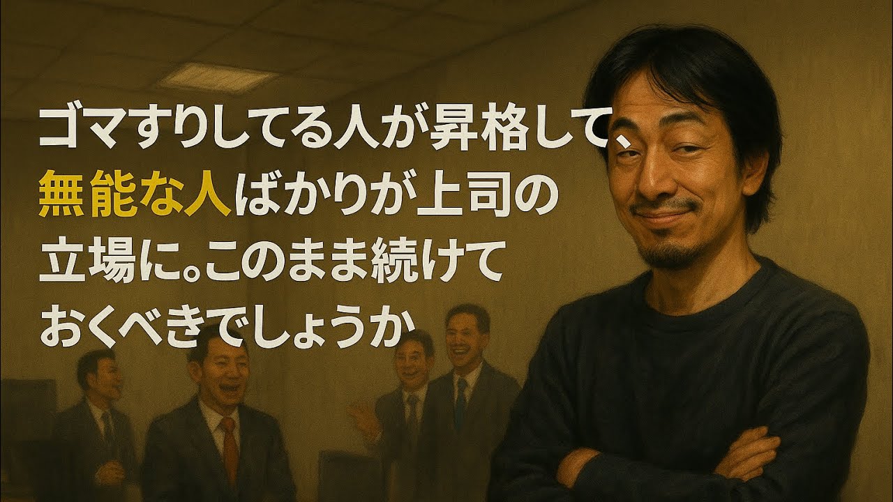こんばんは。40代会社員ですが、高卒から入社し会社での評価は良い方なのですが、中途採用とか後輩が仕事ができないのに人脈が良いからとゴマすりしてる人が昇格して、いまでは無能な人ばかりが上司の立場になりました、結果部下がついていってませんこのまま続けておくべきでしょうか。