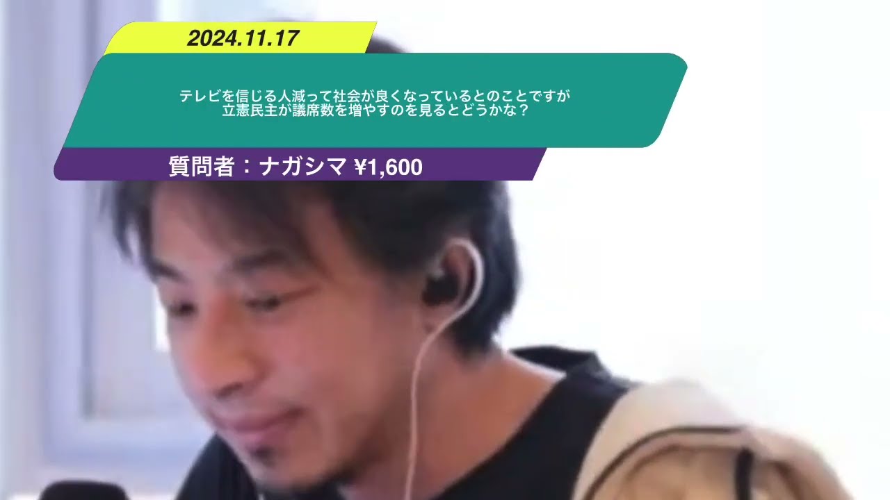 【ひろゆき】テレビを信じるひと減って社会が良くなっているとのことですが、立憲民主が議席数を増やすのを見るとどうかな?ー ひろゆき切り抜き 20241117
