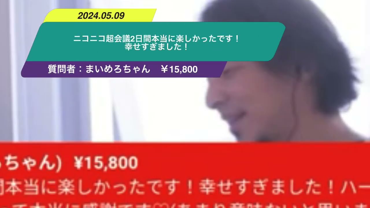 ニコニコ超会議2日間本当に楽しかったです!幸せすぎました!ハードスケジュールでお忙しい中、優しい対応して下さって本当に感謝です♡(あまり意味ないと思いますが、お礼の意味も込めて赤スパ送らせて頂きました♡)ひろゆきさん想像以上にニコニコしててすごく愛嬌のある方だなと感じました。私もひろゆきさんのような愛嬌のある素敵な方になりたいです♡あとひげおやじさんともお話させて頂きましたが、全然死んだ魚の目もしてないしデブじゃないしとても可愛くて素敵な方でした!お二人ともお忙しい中本当にありがとうございました!