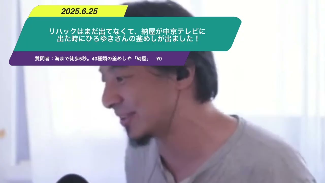 リハックはまだ出てなくて、納屋が中京テレビに出た時にひろゆきさんの釜めしが出ました!作るにちょっと手がかかるので釜めし担当の人が少しだけ苦労してます(笑