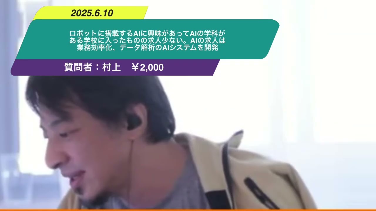 【ひろゆき】ロボットに搭載するAIに興味があってAIの学科がある学校に入ったものの求人少ない。AIの求人は業務効率化、データ解析のAIシステムを開発ー ひろゆき切り抜き 20250610
