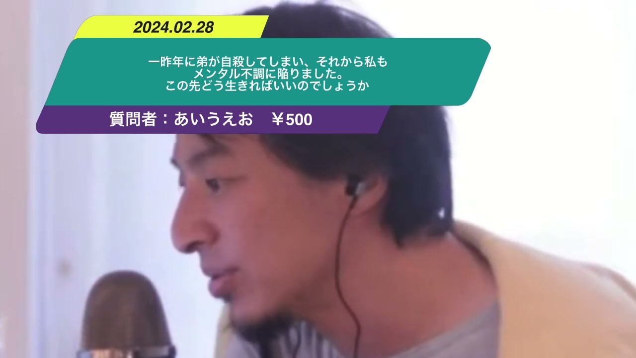 ひろゆきさんこんばんは。29歳男です。一昨年に弟が自殺してしまい、それから私もメンタル不調に陥りました。弟になぜそんな選択をしてしまったのか聞きたい気持ちでいっぱいで、何事も手につきません。職場では明るく振舞えますが、家では暗すぎて妻からも離婚を宣告されました。この先どう生きればいいのでしょうか。