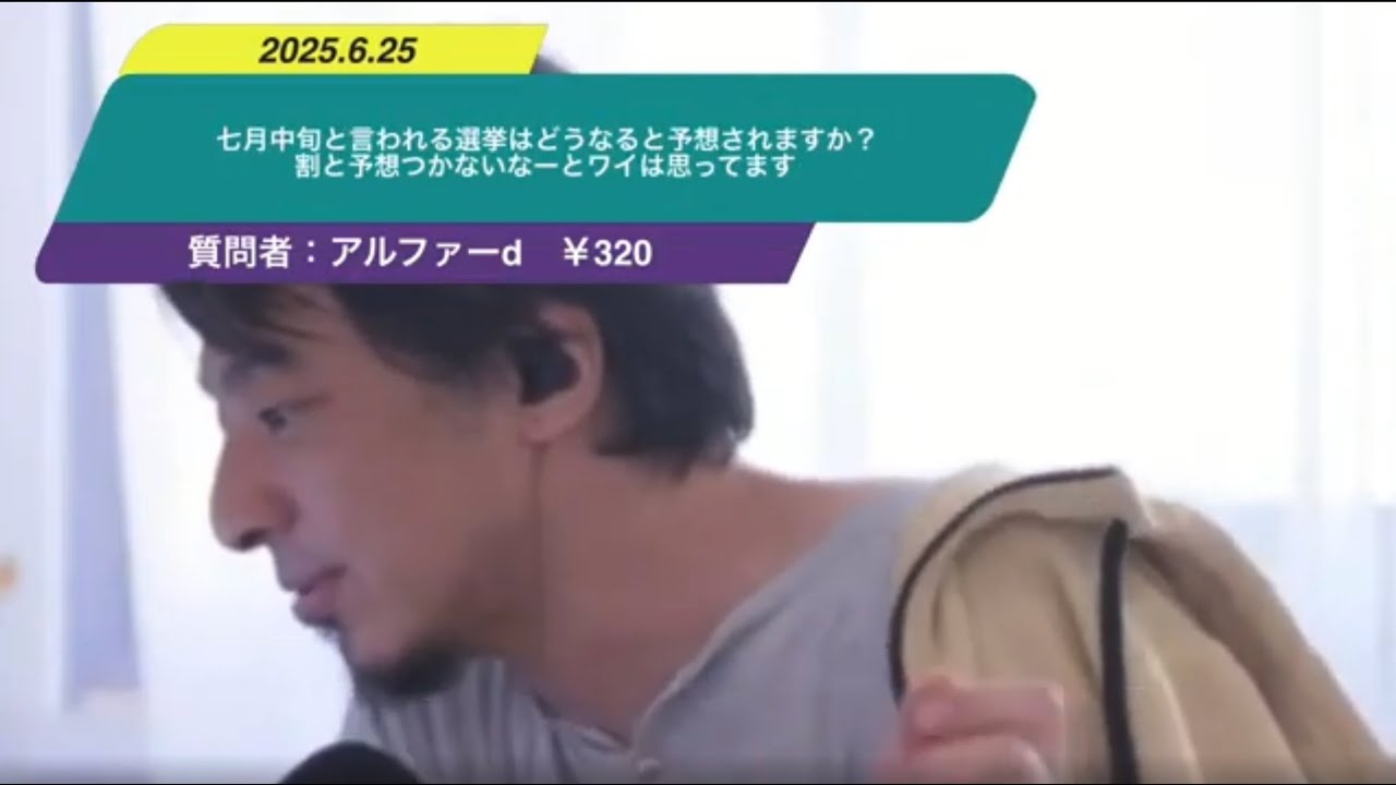 あの、昔ながらの高齢者の人たちはその立憲民主党とか自民党とか公明党という昔ながらの政党に入れ続けるんですけど、あの、そうじゃない人達って情報源がもうすでにテレビではなくなっててネットを見るようになってるので、なのでネットでうまく活動してるところが兵語増えると思っててなのでその令和新撰組と賛成党とN国とあとなんだ、ネット系、あと何個かなかったっけ?っていう感じで割とそのなんかね、あの浸透系のネット系のところが儀績を増やすっていうところになるんじゃないかなと思ってますけど。