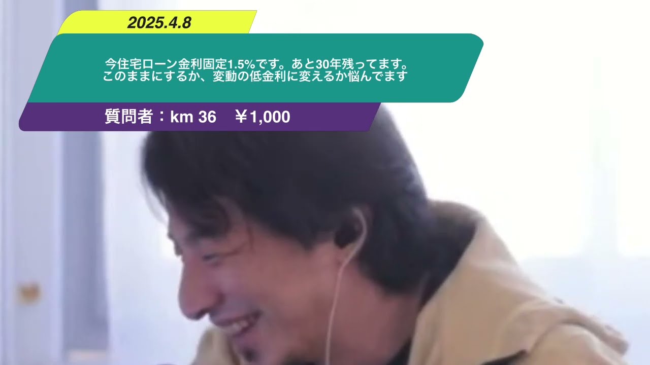もう10年国産今は下がりましたけど、一時1.6%ぐらいまで行ったと思うのでなので、あの、固定金利はむしろラッキーだったって話になると思うんですけど、えっと、要はその最悪な状態というのを避けるというのが僕大事だと思うんですよ。