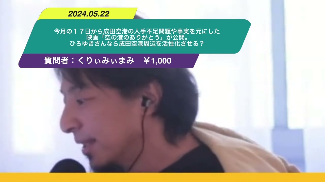 ひろゆきさんこんばんは!今月の17日から成田空港の人手不足問題や事実を元にした、リアルな従業員がたくさん出演している短編映画「空の港のありがとう」が公開されています。いつか機内でも放映するかもしれないので機会があったらぜひ観てください! それにちなみまして、もしひろゆきさんが成田空港周辺に住んでいたらどうやって周辺市町を活性化させるか等アドバイスいただけたら幸いです。