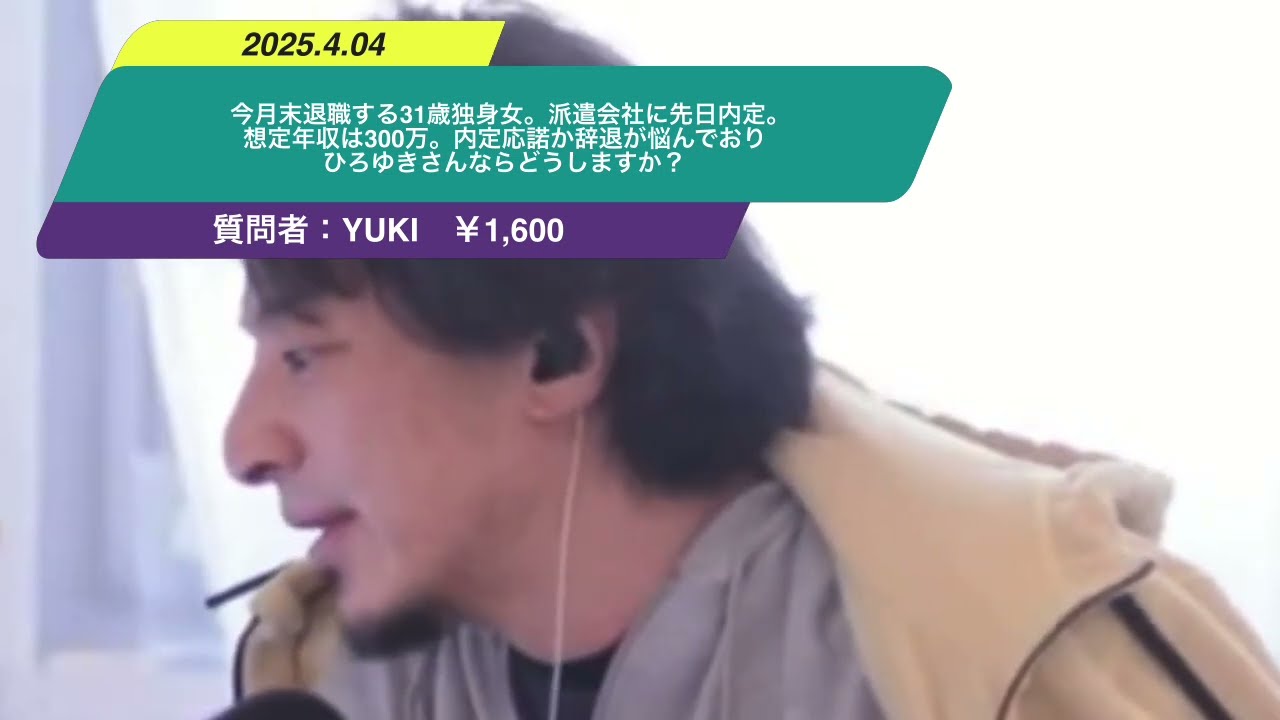 今月末退職する31歳独身女です。医療職で病院勤務10年 年収520万 失業手当や傷病手当を貰い2.3ヶ月働かず過ごそうと思っていました。ですが事務職に転職希望で別業界で転職出来るか心配で早めにエージェントを利用し活動してしまったところ、派遣会社に先日内定貰いました。想定年収は300万。内定応諾か辞退が悩んでおりひろゆきさんならどうしますか。他の企業は書類や面接でかなり落ちその企業が唯一の内定でした