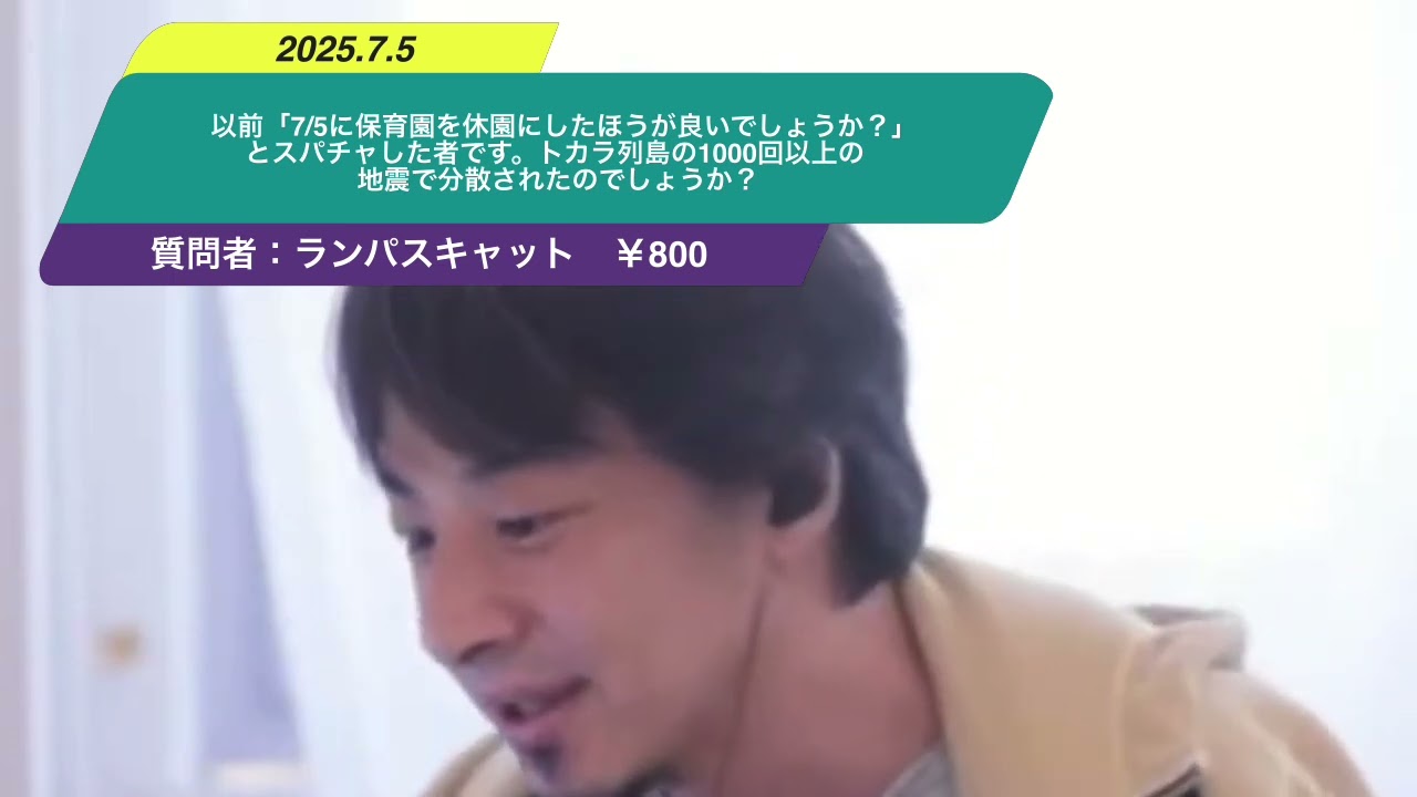 以前「7/5に保育園を休園にしたほうが良いでしょうか?」とスパチャした者です。「しなくて良いでーす」というひろゆきさんの回答通り休園にせず、本日無事に過ごせました。大地震の予知夢でしたが、トカラ列島の1000回以上の地震で分散されたのでしょうか?大きなオナラを小さなオナラで分散させるような感じで。