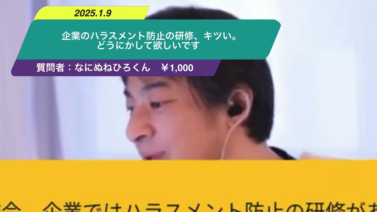 ひろゆきさんこんばんは。昨今、企業ではハラスメント防止の研修があり、ITコンサルの客先が変わる度に研修を受けます。過去にパワハラを受けた自分にとって、苦しい過去を思い出す研修で辛いです。しかも、やる側にならないための研修であり侮辱的でキツく、今日もスピーカーをオフにして聞きました。このようなケースには気を配れないのは仕方ないかもしれませんがどうにかして欲しいです。