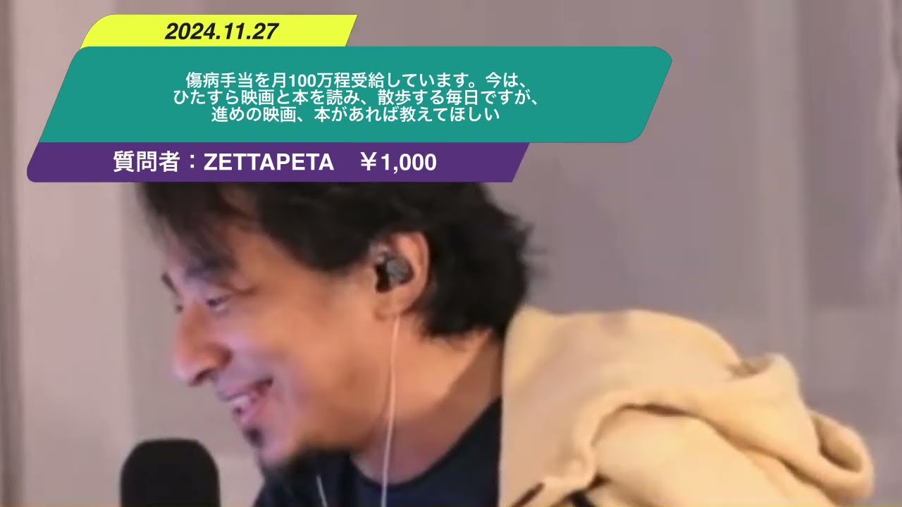 【ひろゆき】傷病手当を月100万程受給しています。今は、ひたすら映画と本を読み、散歩する毎日ですが、進めの映画、本があれば教えてほしいー ひろゆき切り抜き 20241127