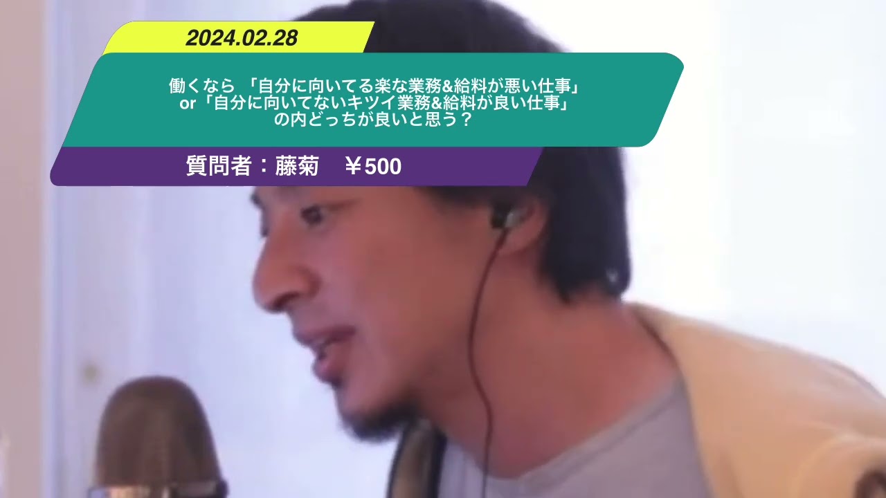 【ひろゆき】働くなら 「自分に向いてる楽な業務&給料が悪い仕事」or「自分に向いてないキツイ業務&給料が良い仕事」 の内どっちが良いと思う?ー ひろゆき切り抜き 20240228