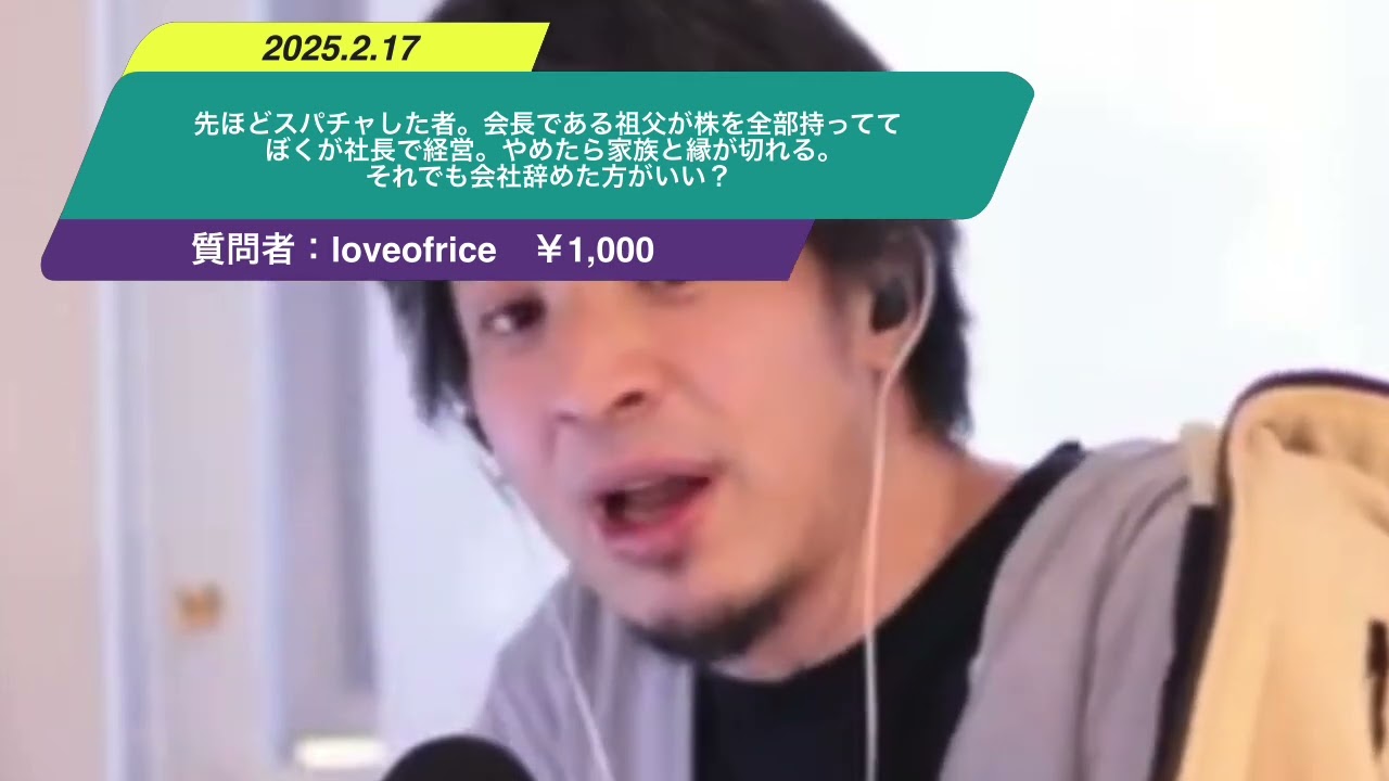 先ほど家業やめる件で、スパチャした者です。会社売却が一番いいんですが、今は会長である祖父が株を全部持ってて、ぼくが社長で日々の経営をしています。多分会社売ることはできないのと、社長やめたら家族と縁が切れると思います。それでも会社辞めて、自分の人生を生きるべきでしょうか?