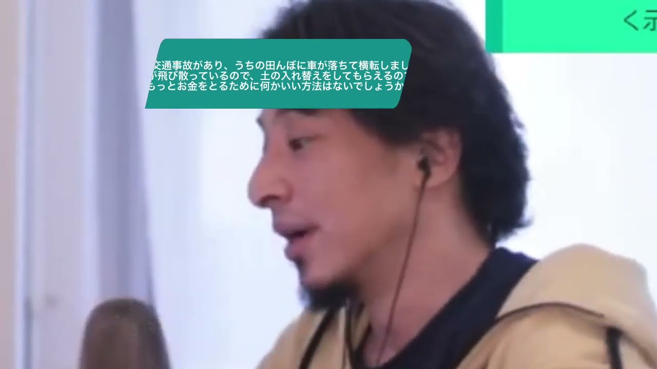 Kind: captionsLanguage: jaえ先日交通事故がありうちの田んぼに車が落ちて横転しましたガラスが飛び散ってるので土の入れ替えをしてもらうのるのですがもっとお金を取るため何かいい方法はないでしょうかタエまであと1ヶ月しかないのでなるべくたくさんお金をもらって早く時短したいですえっとその塗装のだったり何らかしらの薬品が田んぼに入ってしまってそのガラスを拾うだけじゃなくて土自体を入れ替えなきゃいけないとか癖をつけるって手はあるんですけどま基本何癖なのであのあんまりお勧めはしないですね太りをしたいっていうのは保険会社た相手だとほとんど通用しないのでなのでむしろなんかあのいろんなトラブルが増えるんじゃないかなていう気がします