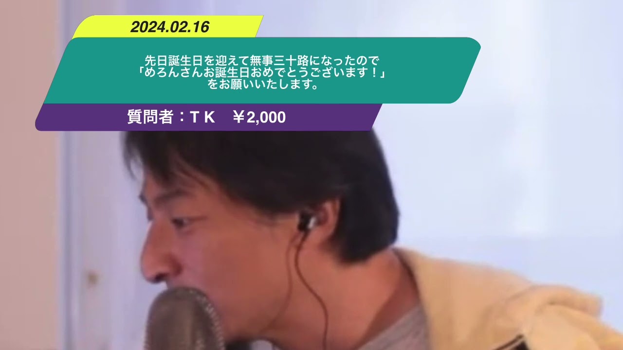 ひろゆきさんこんばんは!おかえりなさい🇫🇷先日誕生日を迎えて無事三十路になったので「めろんさんお誕生日おめでとうございます!」をお願いいたします。 これからも陰ながら応援してます〜!大好きです!