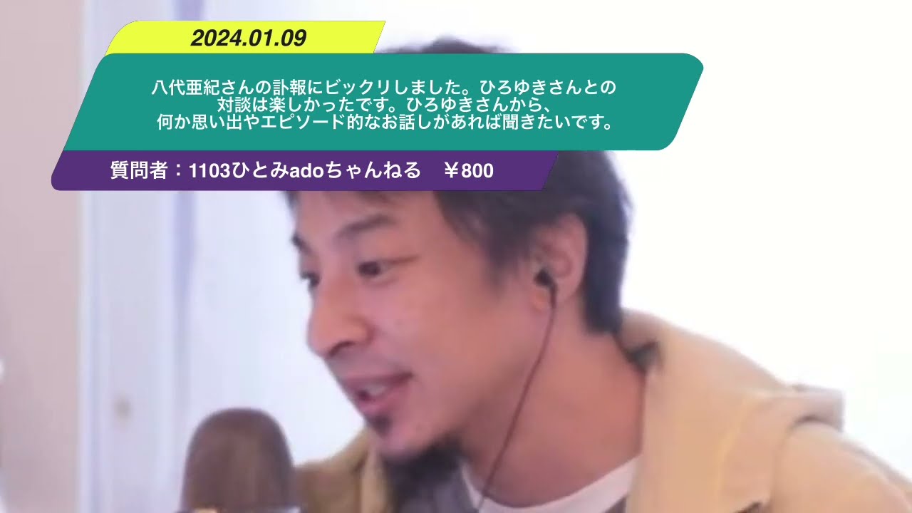 本日、八代亜紀さんの訃報にビックリしました。ひろゆきさんとの対談は楽しかったです。ひろゆきさんから、何か思い出やエピソード的なお話しがあれば聞きたいです。