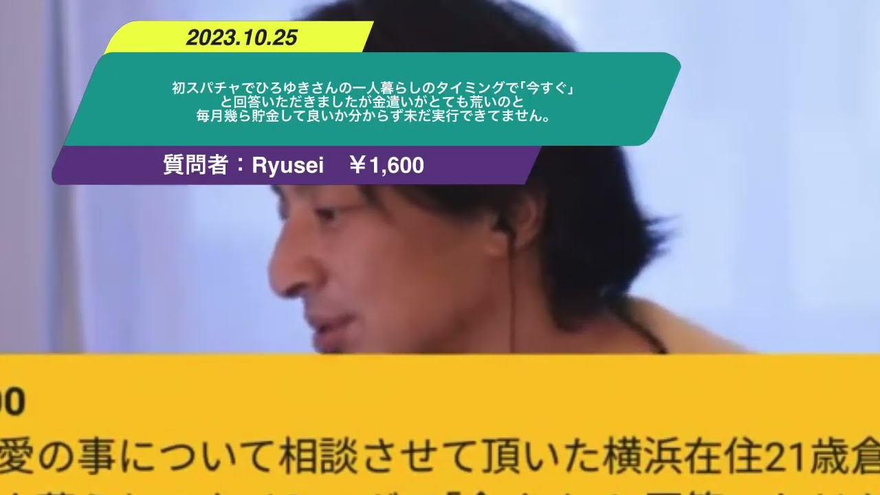 以前毒親と恋愛の事について相談させて頂いた横浜在住21歳倉庫業発達障害です。初スパチャでひろゆきさんの一人暮らしのタイミングで「今すぐ」と回答いただきましたが金遣いがとても荒いのと毎月幾ら貯金して良いか分からず未だ実行できてません。月収は20万、親には貯金として3万、親のお金に3万渡していて、来年からさらに個人的に10万貯める予定です。何となくですが家賃7~8万ぐらいの家に住みたいと思っています。