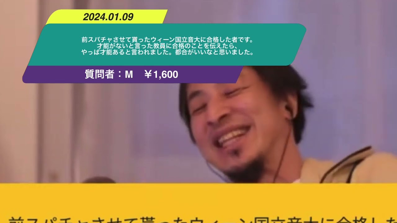 こんばんわ。前スパチャさせて貰ったウィーン国立音大に合格した者です!この間、高校の時の「お前は音楽の才能がない」と言った教員に音楽コンサートでお会いしまして、「お陰様でウィーンの音大に合格しました」と言ったところ、「俺の見立て通りだ。やっぱ才能があった」と言われたので、「前、お前才能ないって言ってましたよね?」と反論した所、言葉に詰まってて面白かったです!笑人間って都合が良いな〜と常々感じます。笑