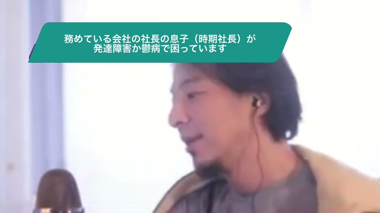 務めている会社の社長の息子(時期社長)が発達障害か鬱病で困っています。(全く喋らない笑わない空気が読めない仕事が遅いトイレがやたら長い等)周りが優秀ならなんとかなると思いますがひろゆきさんはどう思いますか?ちなみに今の女社長もこいつは駄目だから皆頼んだと言っています。