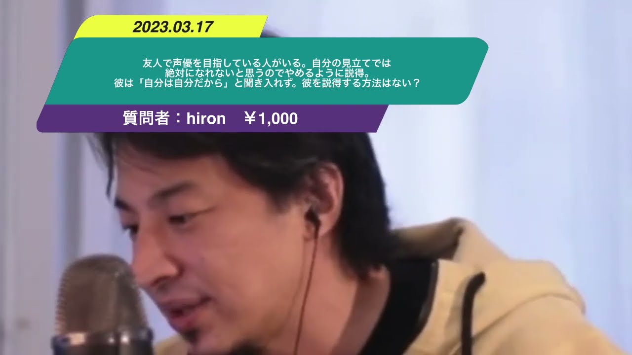 Kind: captionsLanguage: jaえ以前声優をやめてこう無いになっともうです私の友人で声優を目指している人がいるのですが自分の見立てでは絶対になれないと思うので自分の専門学校などの経験を生かしながら考え直すように促してるんですが彼は自分は自分だからときれてくれませんどうにか彼を説得する方法はないでしょうかありません説得する必要があると思ってるのが間違いだと思いますま基本的に声って儲かる人ほとんどいないんですけど趣味でやりたいっていう人がやるっていうだけなので別にせりゃいいんじゃないですか好きにやればいいんじゃないかなと思いますそのえっと今の会社を辞めて声優で食ってくんだとかって言ってもあの会社辞めたからって声優の仕事がもらえるわけじゃないので今の仕事をしながら声優事務所に登録して仕事がある時だけ会社有給取って仕事したらってなると多分登録しても何の仕事も来ないのでなので何の問題もなく声優になりたいってずっと言って声優事務所を登録してる人っていうだけになると思うのでその声優になるという夢を潰すんじゃなくて今の仕事やめない方がいいよっていう形でアドバイスをした方がいいんじゃないかなと思います