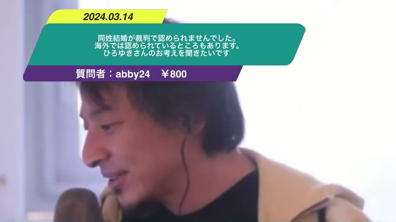こんばんは。ひろゆきさん^_^今日同姓結婚が裁判で認められませんでした。海外では認められているところもありますが、私は自由にすればいいと思うのですが、男と女と言うところでどうしてこんなにこだわりを持つのでしょう?ひろゆきさんのお考えを聞きたいです。よろしくお願いします。