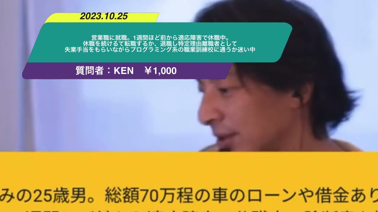 【ひろゆき】営業職に就職。1週間ほど前から適応障害で休職中。休職を続けるて転職するか、退職し特定理由離職者として失業手当をもらいながらプログラミング系の職業訓練校に通うか迷ってます。ー20231025