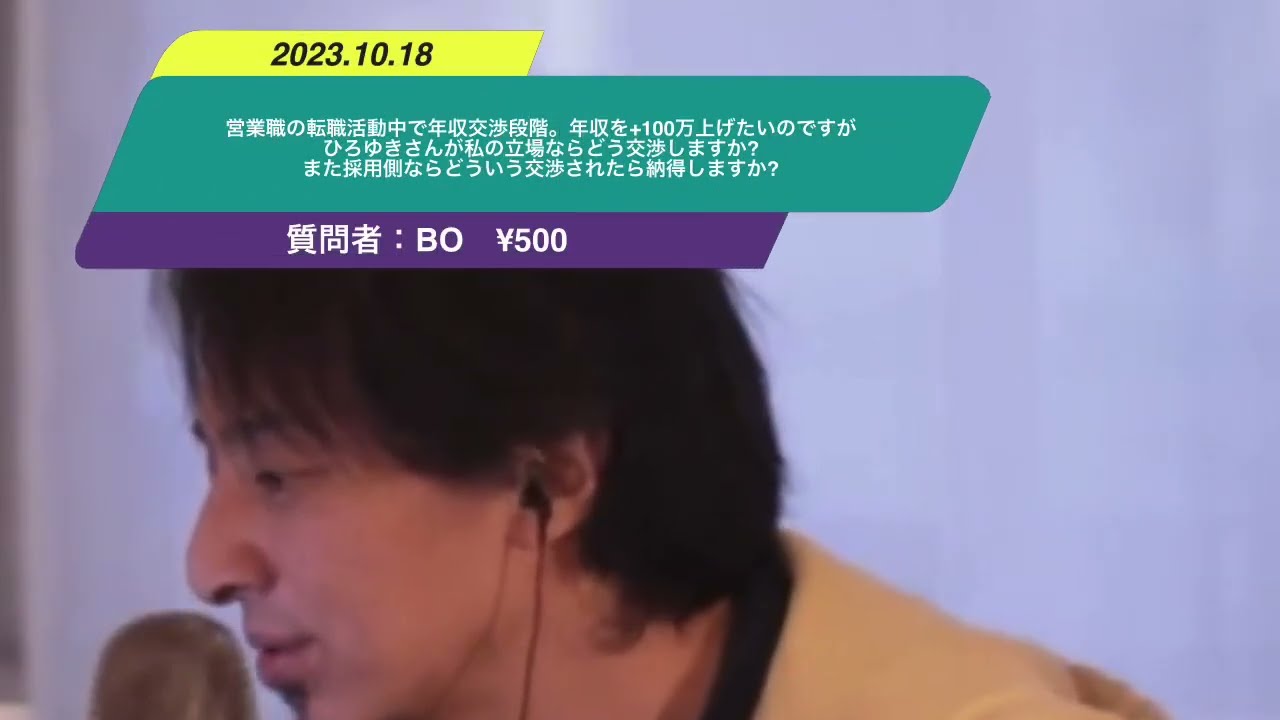 【ひろゆき】営業職の転職活動中で年収交渉段階です。現職の年収より+100万上げたいのですが、ひろゆきさんが私の立場ならどう交渉しますか? また採用側ならどういう交渉されたら納得する?ー20231018