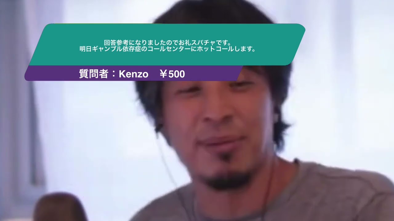 先程ギャンブル好きの質問したものです。回答参考になりましたのでお礼スパチャです。明日ギャンブル依存症のコールセンターにホットコールします。