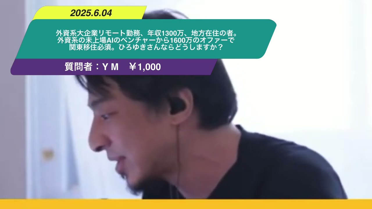 【ひろゆき】外資系大企業リモート勤務、年収1300万、地方在住の者。外資系の未上場AIのベンチャーから1600万のオファーで関東移住必須。ひろゆきさんならどうする?ーひろゆき切り抜き 20250604