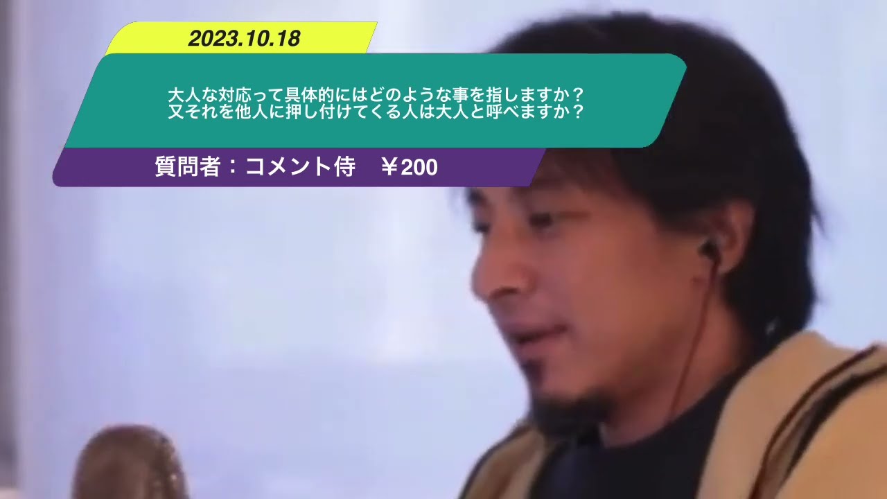 Kind: captionsLanguage: ja大人な対応って具体的にどのようなことをさしますかまたそれを他人に押し付けてくる人は大人と呼べますかま大人な対応っていうのはその周りの人たちにとって1番効率的で特をする対応大人の対応と言ったりするのであなたにとっての大人の対応はそれなんですねていう話なので別にあんまり間に受けてもしょうがないんじゃないかなと思いますけど