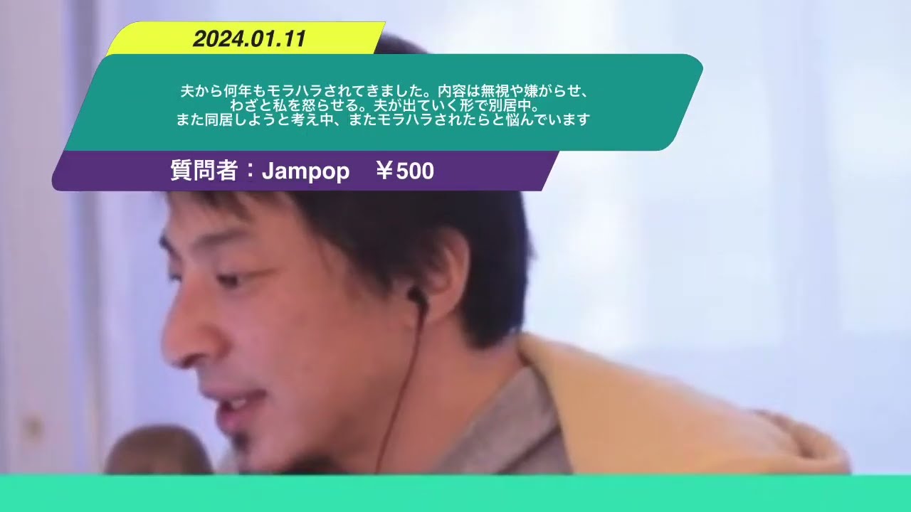 【ひろゆき】夫から何年もモラハラされてきました。内容は無視や嫌がらせ、わざと私を怒らせる。夫が出ていく形で別居中。また同居しようと考え中、またモラハラされたらと悩んでいますー 20240111