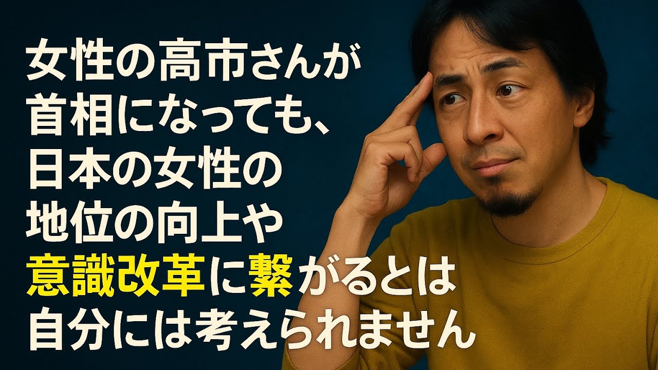 今日もご饒舌素晴らしいです。女性の高市さんが首相になりまして、多少社会が変わるとしても、専業主婦になりたい、と言う若い女性もまだまだいるし、日本の女性の地位の向上や意識改革に繋がるとは、自分にはとうてい考えられません。ひろゆきさんはどう考えますか?。