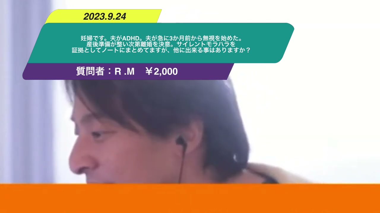 【ひろゆき】妊婦です。夫がADHD。夫が急に3か月前から無視を始めた。産後準備が整い次第離婚を決意。サイレントモラハラを証拠としてノートにまとめてますが、他に出来る事はありますか?ー 20230924