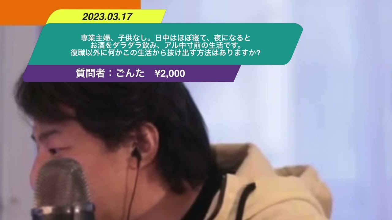 30歳女です。転職先を決めず仕事を辞めたタイミングでプロポーズされ結婚し、そのまま専業主婦になりました。子供もいないので家事も一日数時間で終わり毎日暇で、日中はほぼ寝て、夜になるとお酒をダラダラ飲み、ひろゆきさんの過去動画を見る毎日です。 このままではいけないと思い習い事やジム通いもはじめましたが、とはいえ暇で先述の通りアル中寸前の生活です。復職以外に何かこの生活から抜け出す方法はありますか?