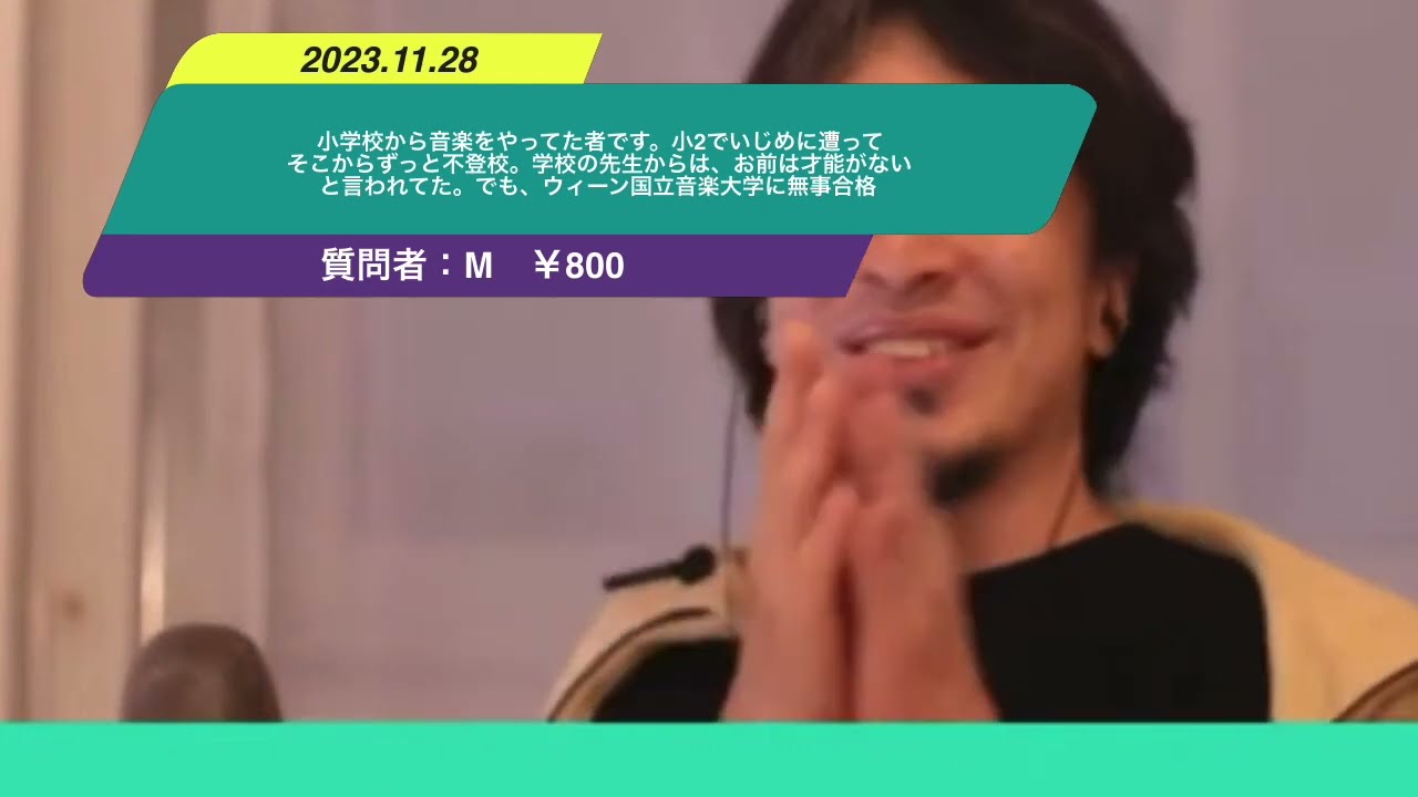 小学校から音楽をやってた者です。小2でいじめに遭ってそこからずっと不登校で、通信制高校に通っていました。学校の先生からは、ずっとずっとお前は才能がないと言われ続けたのですが、先日ウィーン国立音楽大学に無事合格できました。なんか馬鹿にしてた奴らを見返せてよかったです。ひろゆきさんに合格祝って欲しいです