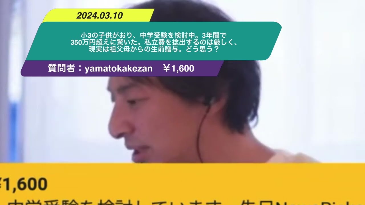 【ひろゆき】小3の子供がおり、中学受験を検討中。3年間で350万円超えに驚いた。私立費を捻出するのは厳しく、現実は祖父母からの生前贈与。どう思う?ー ひろゆき切り抜き 20240310