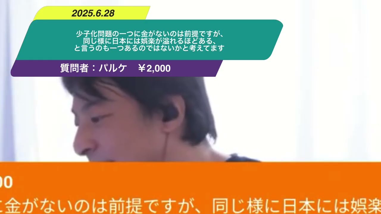 【ひろゆき】少子化問題の一つに金がないのは前提ですが、同じ様に日本には娯楽が溢れるほどある、と言うのも一つあるのではないかと考えてます。ー ひろゆき切り抜き 20250628