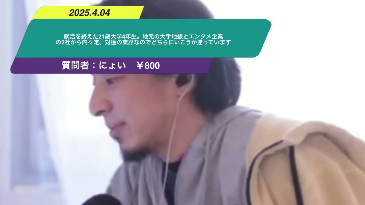 就活を終えた21歳大学4年生です。地元の大手地銀とエンタメ企業(グロース市場上場)の2社から内々定をいただきました。エンタメ企業は、ゲームセンター事業が中心で、海外進出も行っていますが、現時点での年収は微妙です。対極の業界なのでどちらにいこうか迷っています。アドバイス頂けたら嬉しいです。