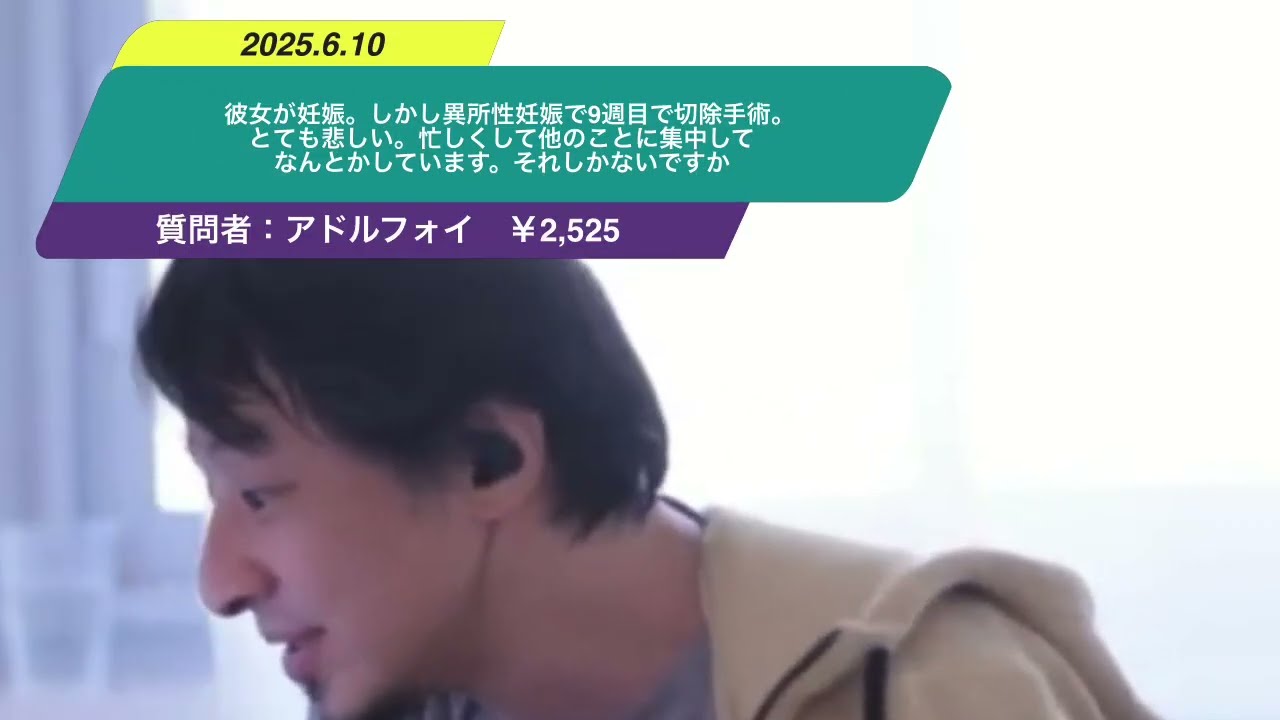 俺の彼女が妊娠しました。しかし異所性妊娠で卵管で成長してたので9週目で切除手術しました。彼女が手術で生命が助かったので良かったです。ただ俺の子供が亡くなったのが毎日とても悲しく、名前もつけて神社で個人で水子お祈り(5円)もしました。以前ひろゆきさんが他の方におっしゃってたように、仕事で忙しくして他のことに集中してなんとかしています。それしかないですか。