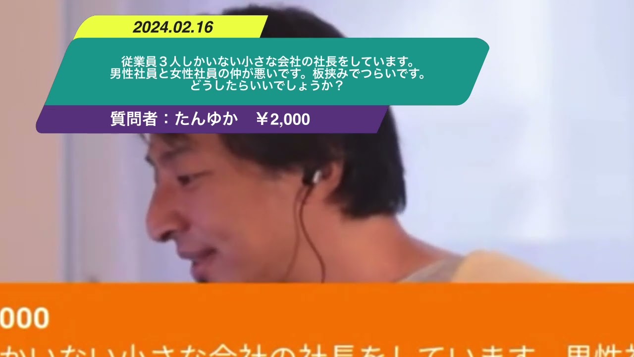 Kind: captionsLanguage: jaえっと従業員3人しかいない小さな会社の社長しています男性社員と女性社員の中は悪いですここに個人面として空気は悪な悪くならないように適の仲良く仕事してほしいと言ってるのですが結局車内の空気は悪いままです男性社員が娘さんのインフルで休んだ時休み上がってと女性社員が術を言っていたり大して男性社員女性員が使えないとこっていたりみ辛いですどうしたらいいでしょうか人を増やすまあの結局そのやっちゃいけないよねっていうことをやったとしてもあの人数が少ないから首にできないっていう問題だと思うんですよねなのであのこれやっちゃいけないよねってやるんだったらもう首にしますよっていう形にするのとあと結局その人数を増えるとその派閥というのが要は1人増えるだけで派閥の力学って変わったりするんですよねなのであの人を増やすすっていう方がいいんじゃないかなと思いますけど